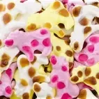 ngrédients: Sirop de glucose, sucre, lait écrémé en poudre (6%), gélatine, acidifiants : acide citrique et acide lactique, gélifiant : pectine, arômes, colorants (sureau, cassis, carotte noire, curcuma, citron, carthame, sirop de sucre caramélisé), agent d'enrobage: cire d'abeille, cire de carnauba.